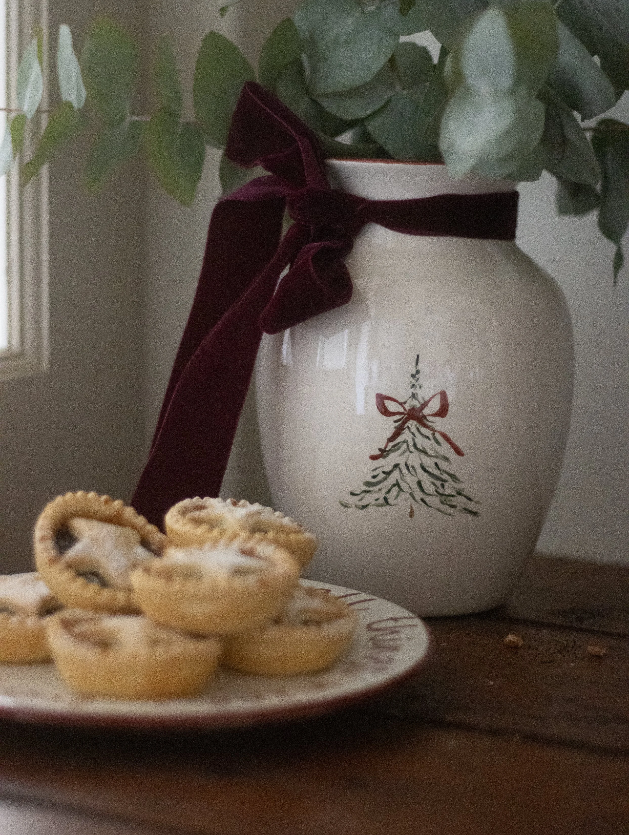 Ceramic round mince pie plate with a hand-painted festive foliage design.