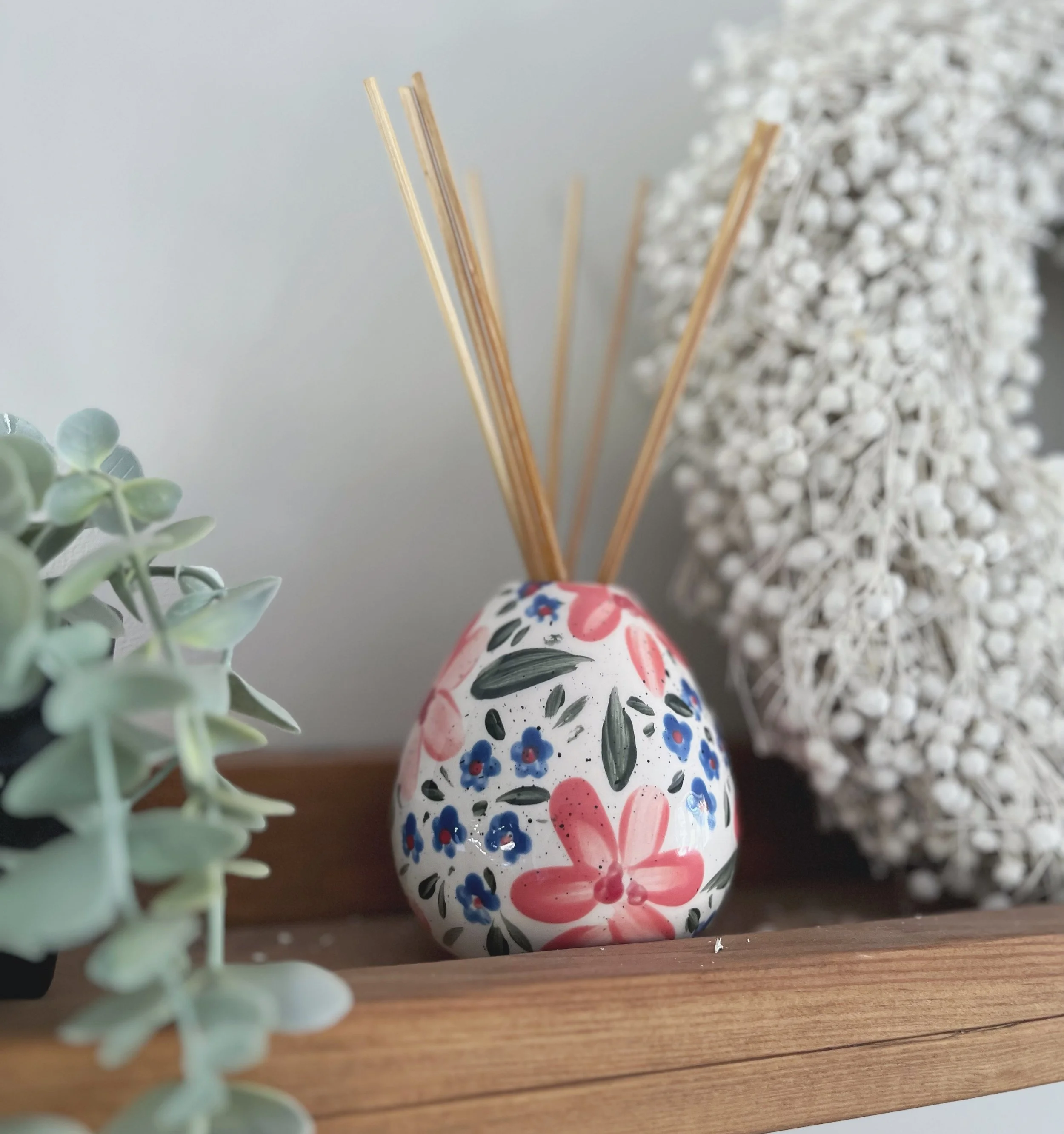 Ceramic reed diffuser hand-painted with a pastel pink floral design.