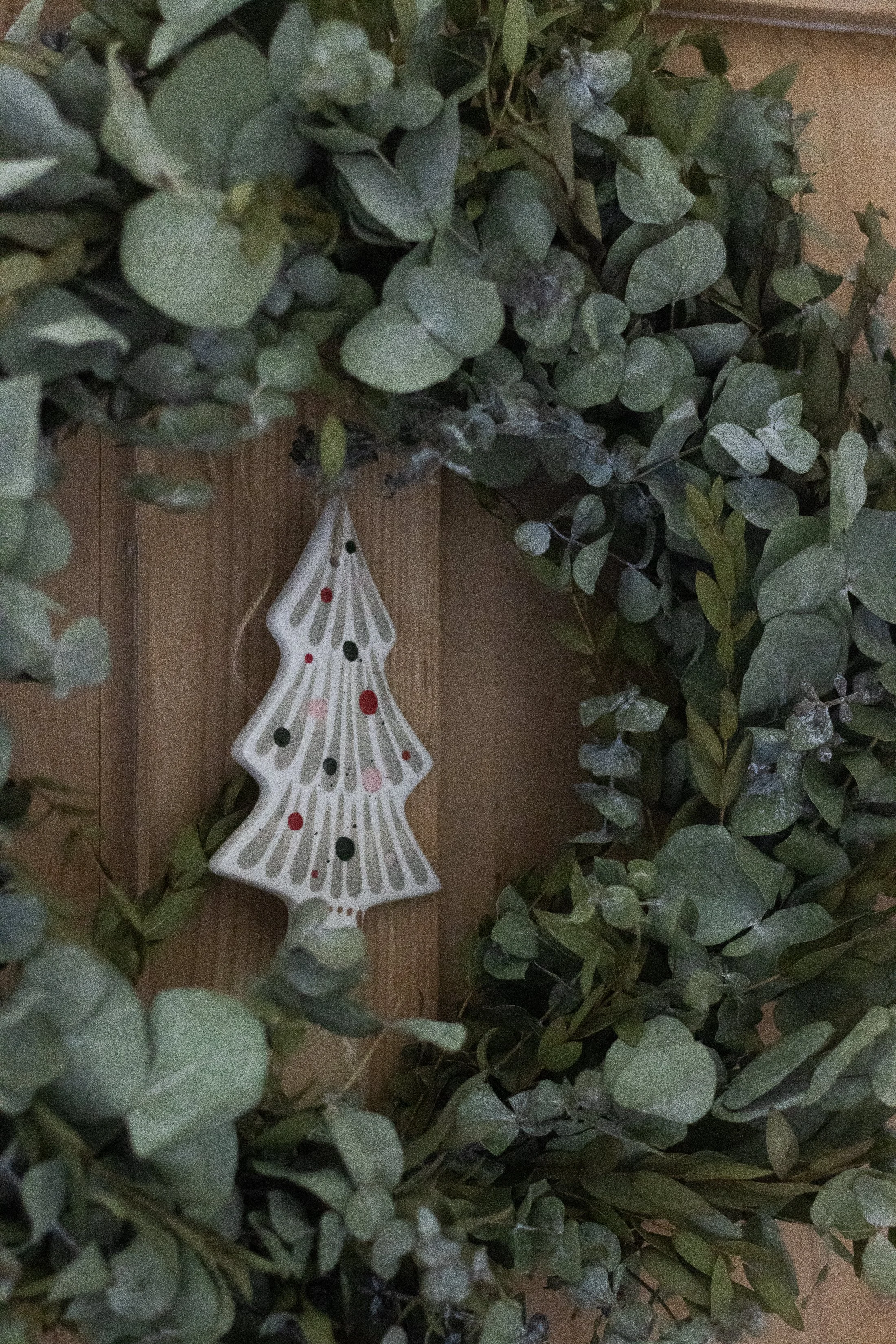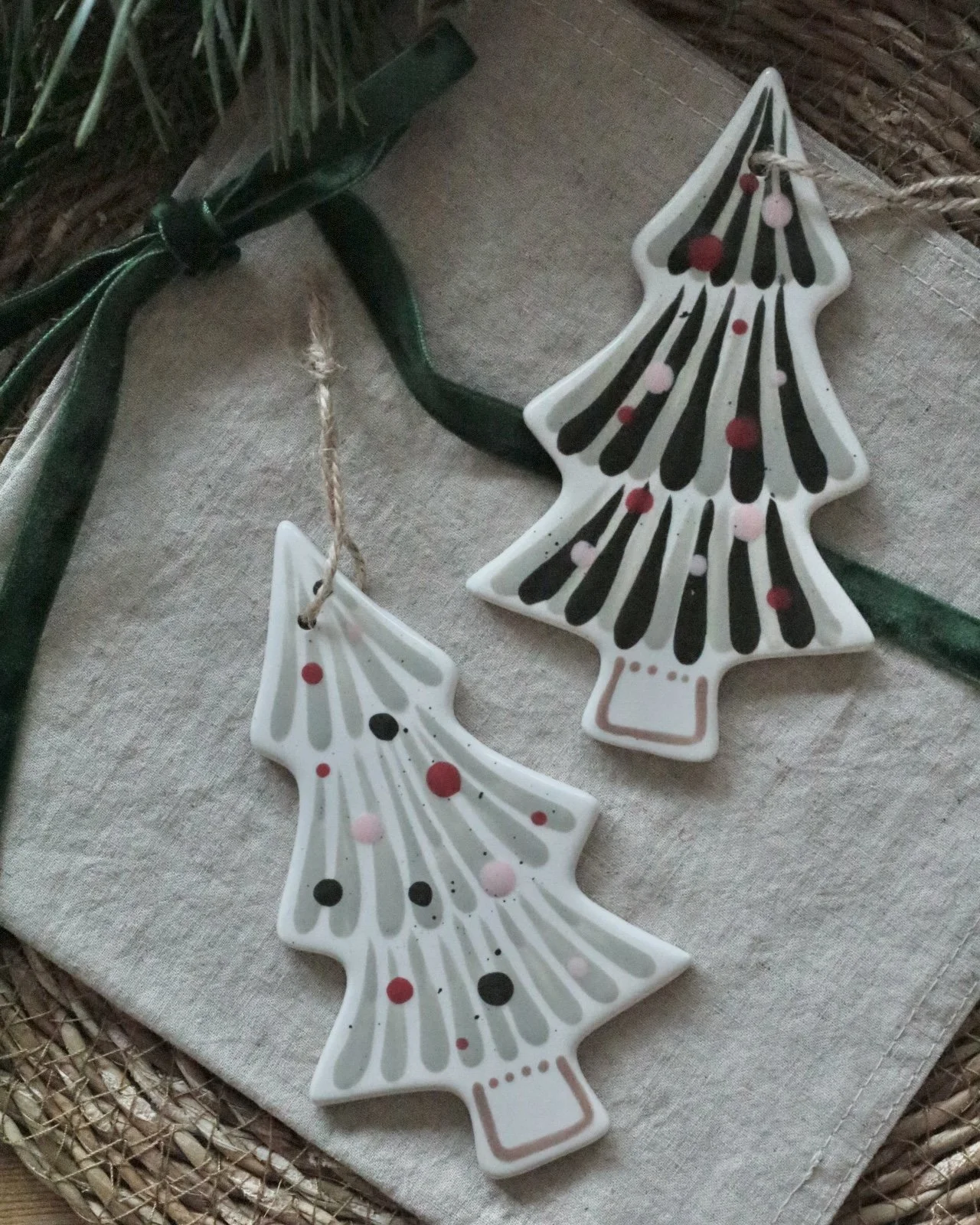 Hand-painted and glazed ceramic bauble, covered in a mix of monochrome designs.
