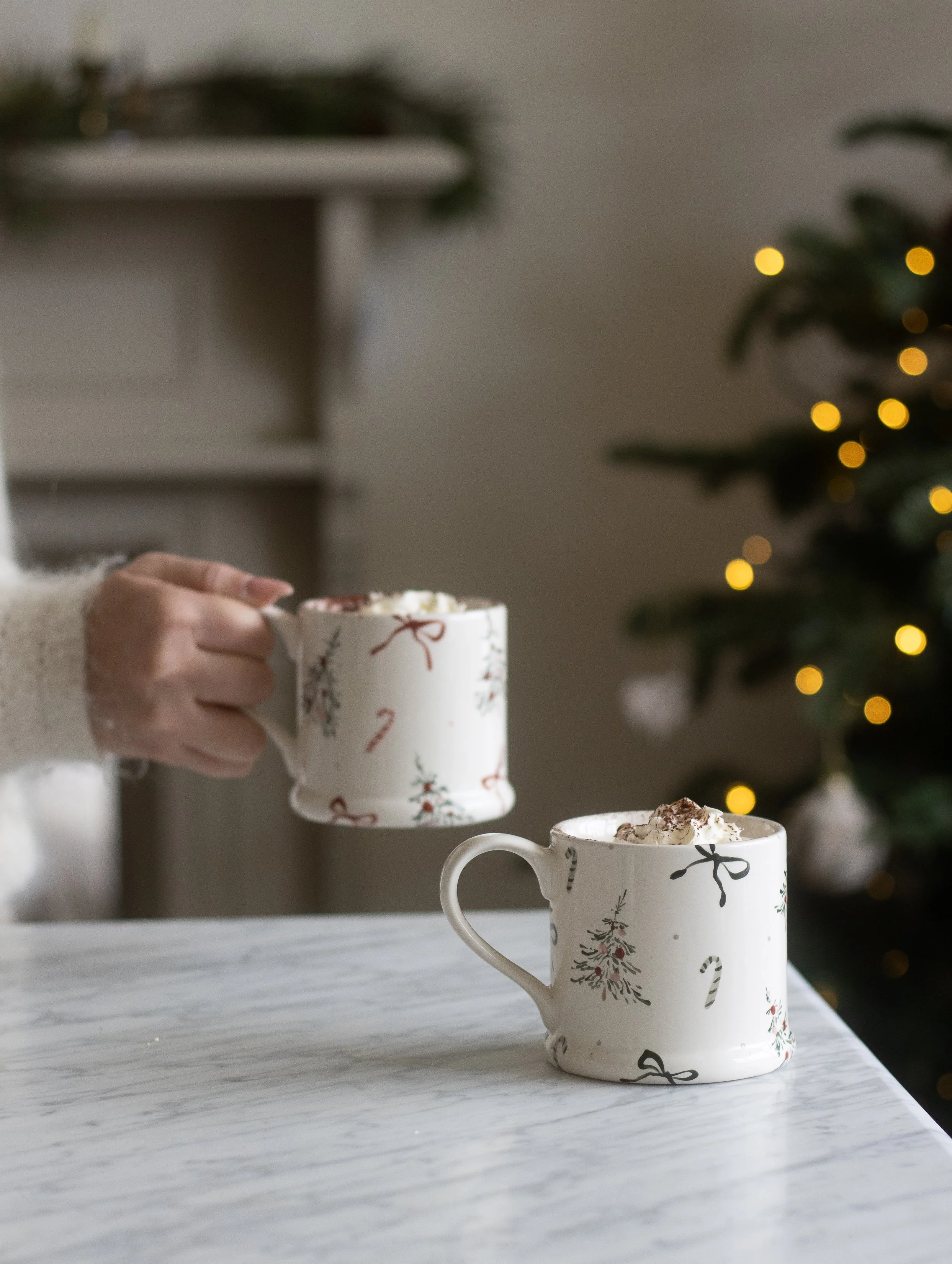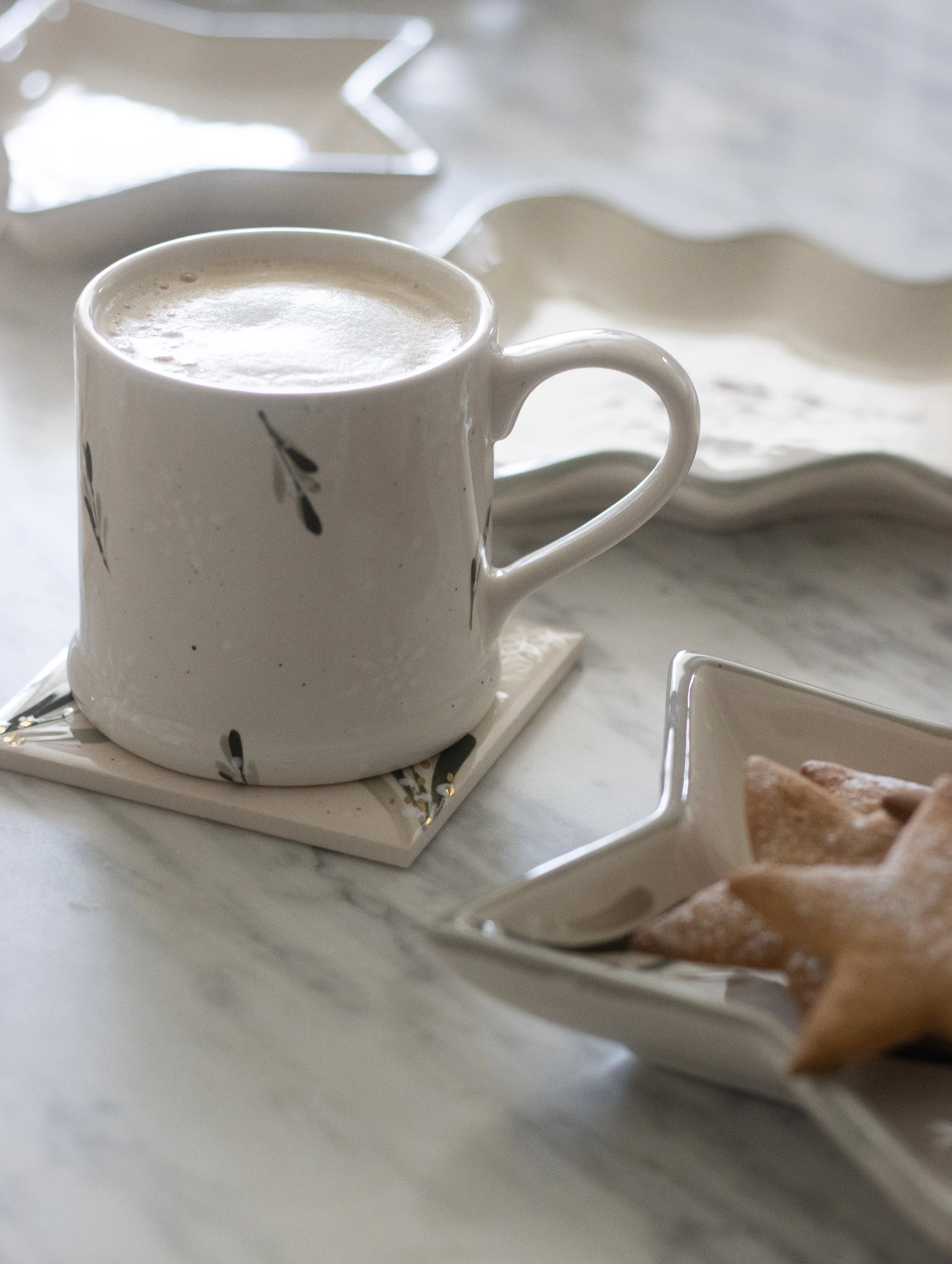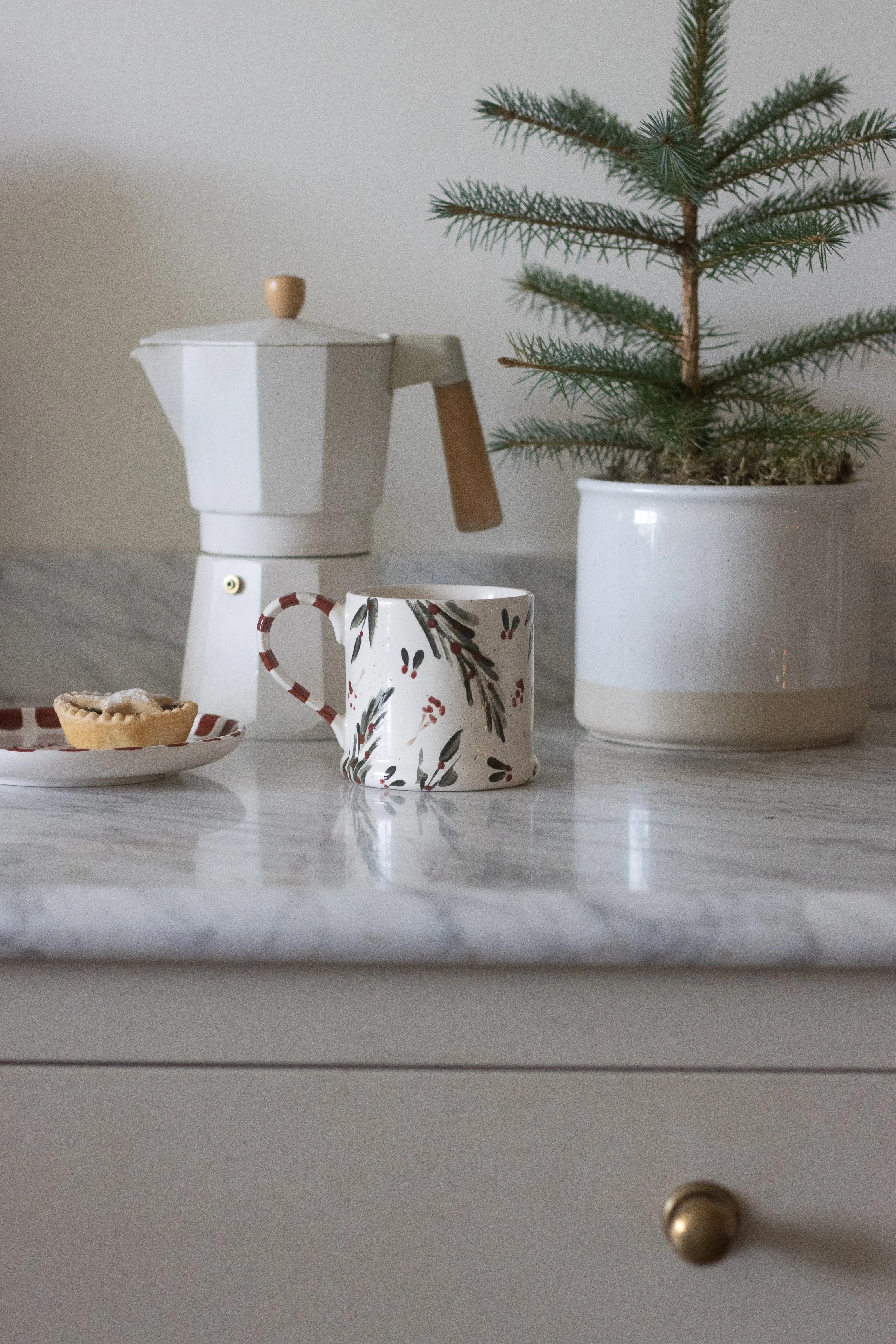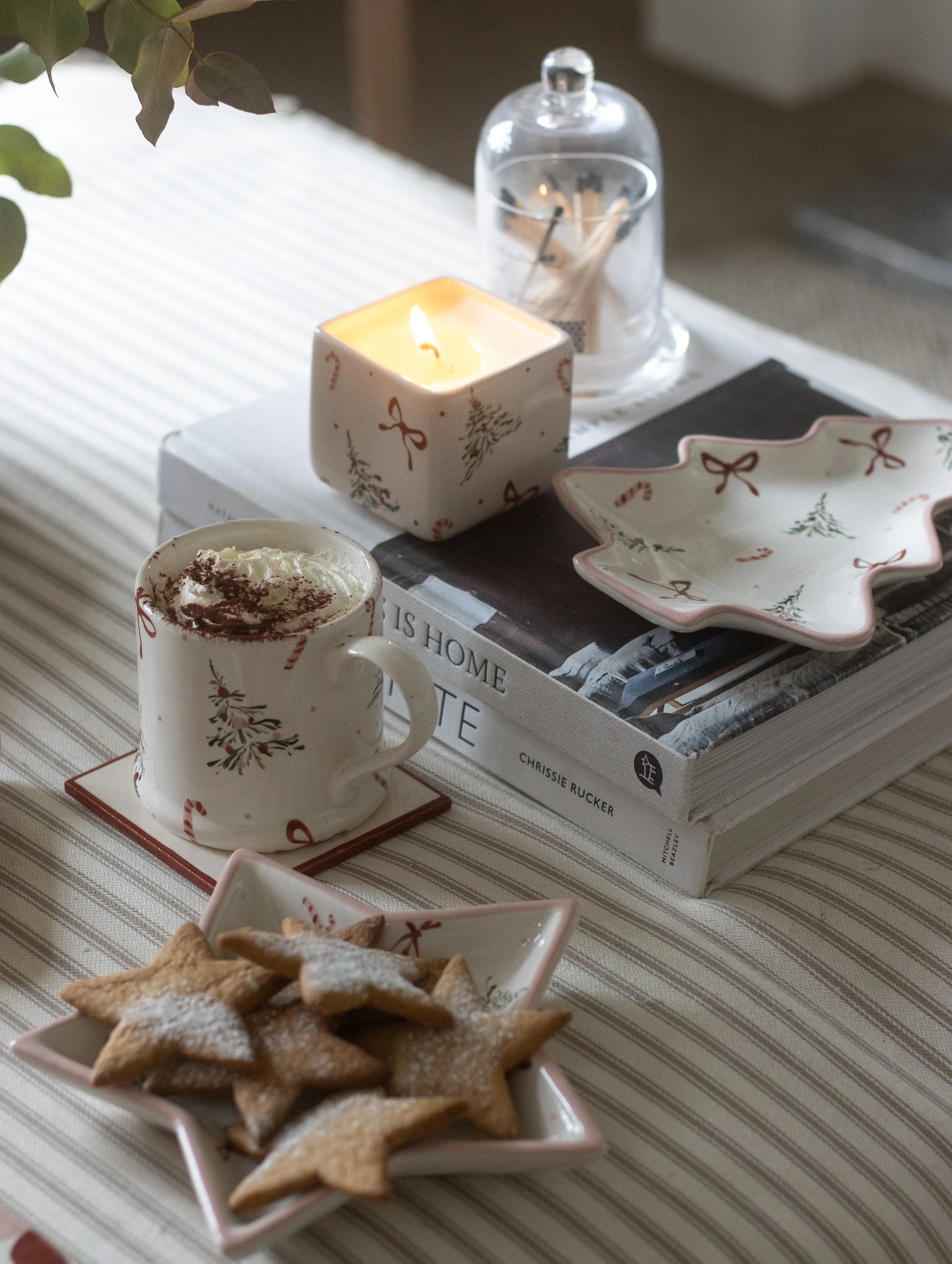 Pack of 3 mini ceramic decor pieces. Choose from either a pack of stars or a pack of hearts. Star decorations feature a hand-painted Christmas tree and the heart decoration feature our festive foliage design.