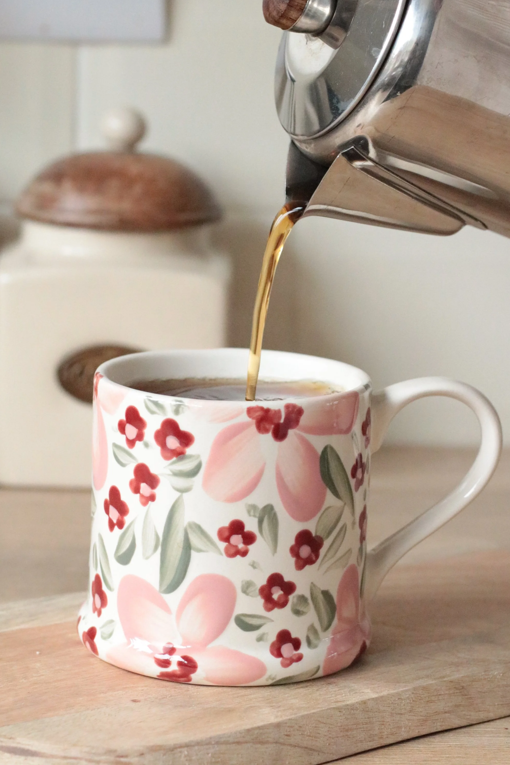 Hand-painted ceramic square coasters, in a floral design finished with glimpses of gold detailing.