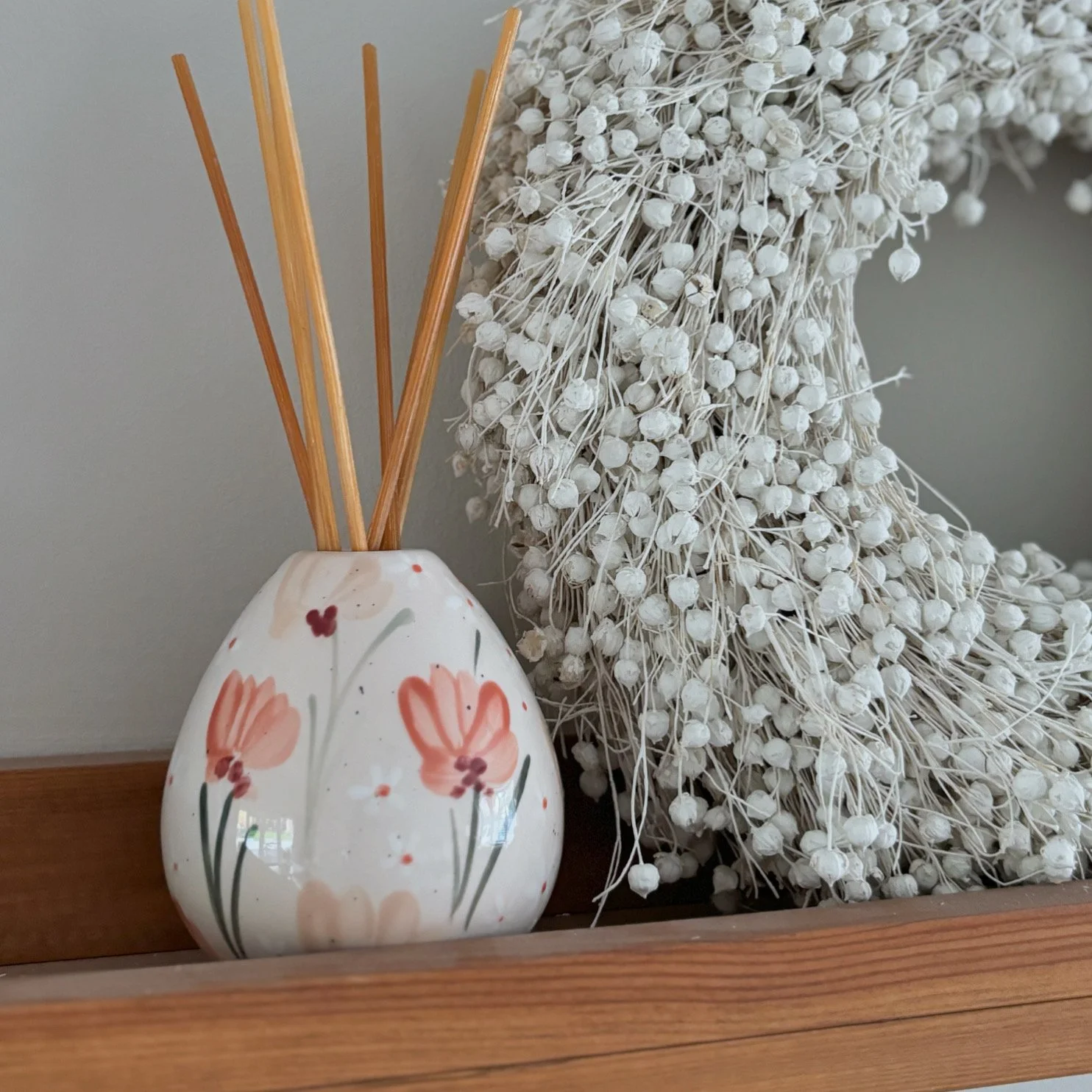 Ceramic reed diffuser hand-painted with a black and cream abstract design.