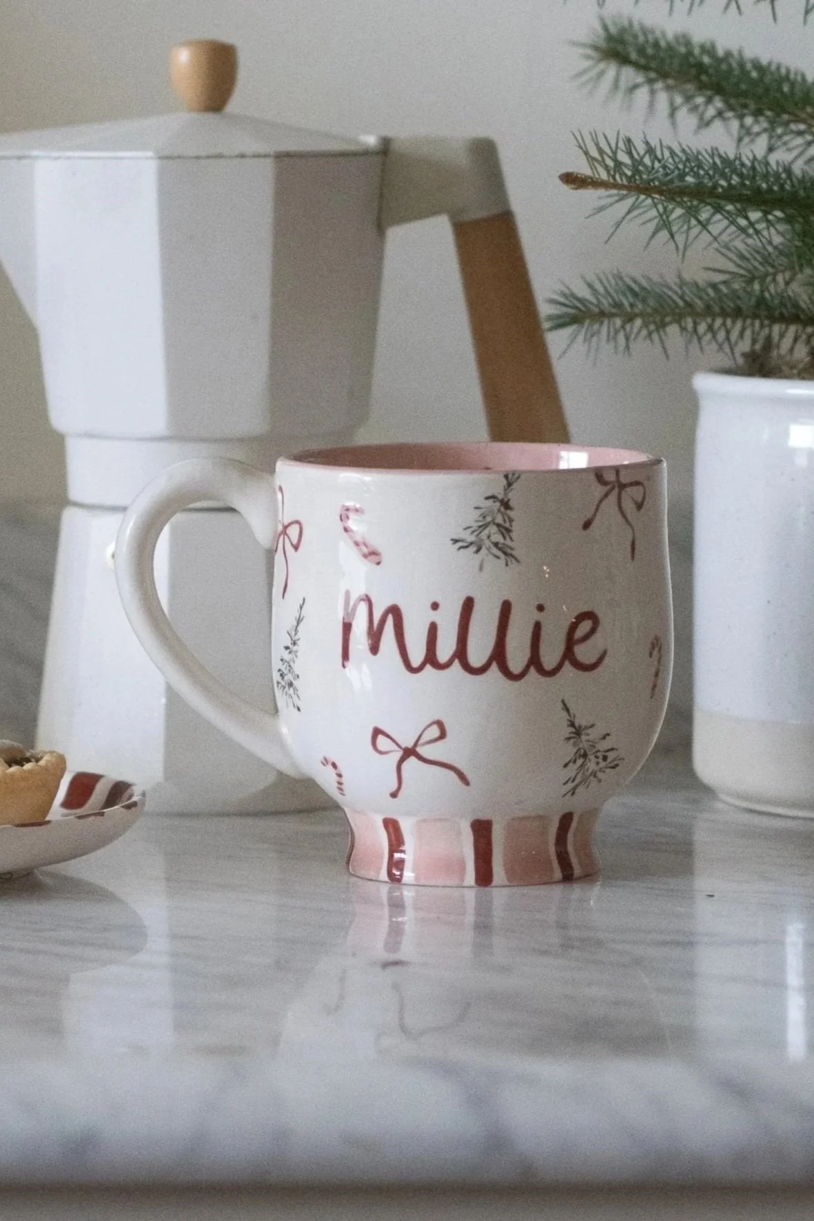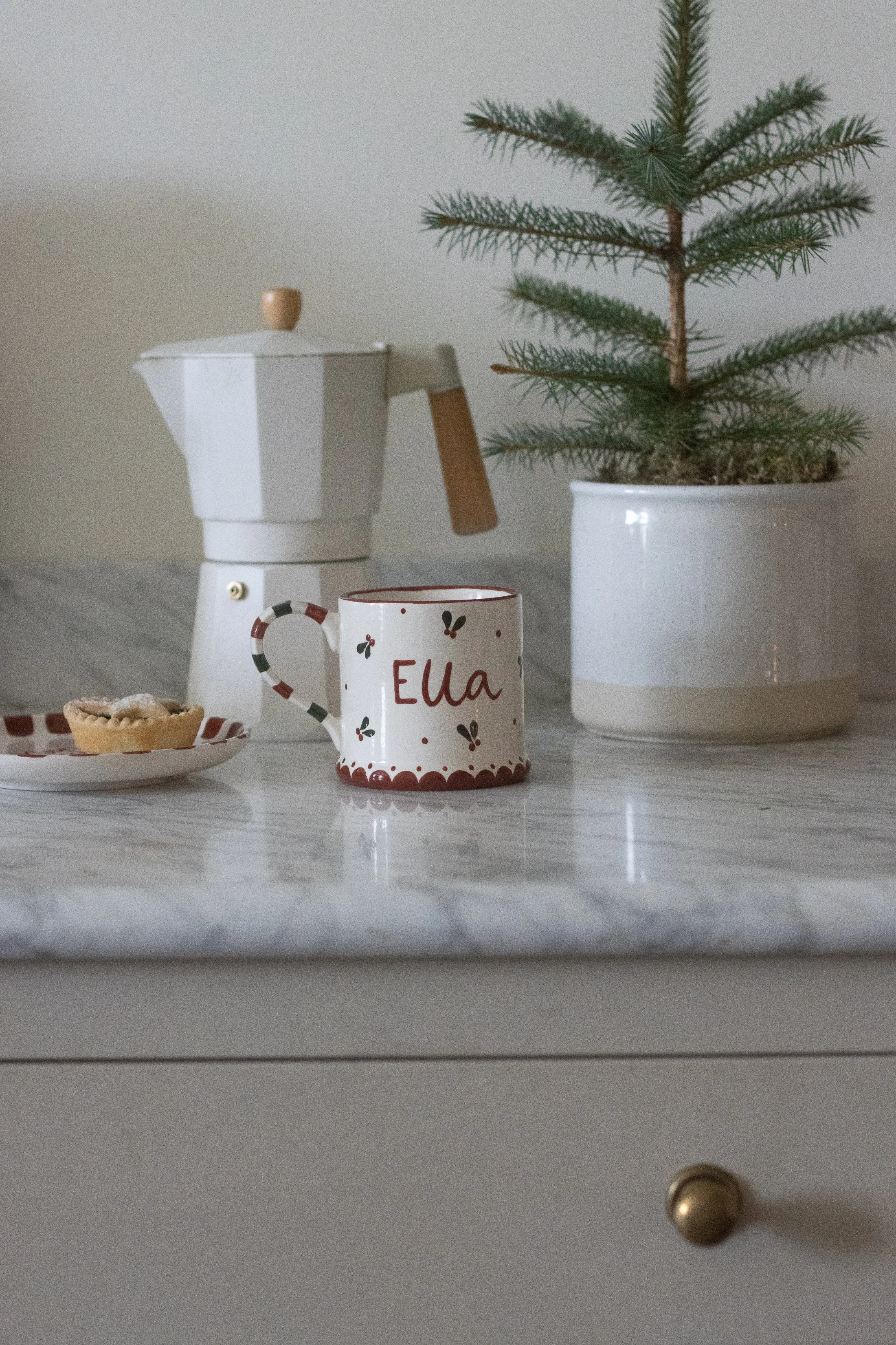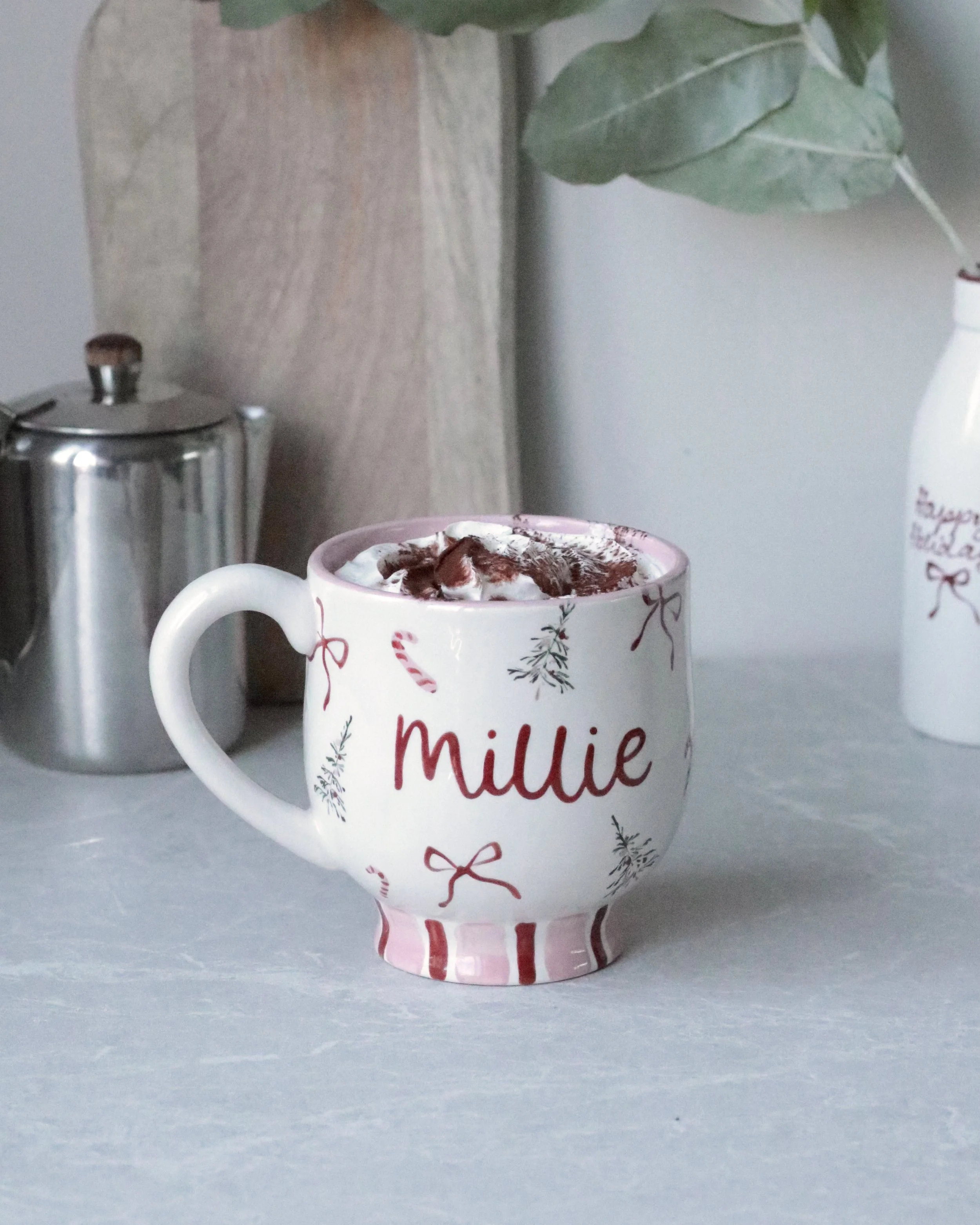 Traditional ceramic vase, featuring a hand-painted classic Christmas design.The burgundy design gives a traditional yet timeless vibe. The vase can be personalised with your family/surname on the front to read ‘Christmas with the…’ it also includes a hand-painted Christmas tree on the back of the vase too.
