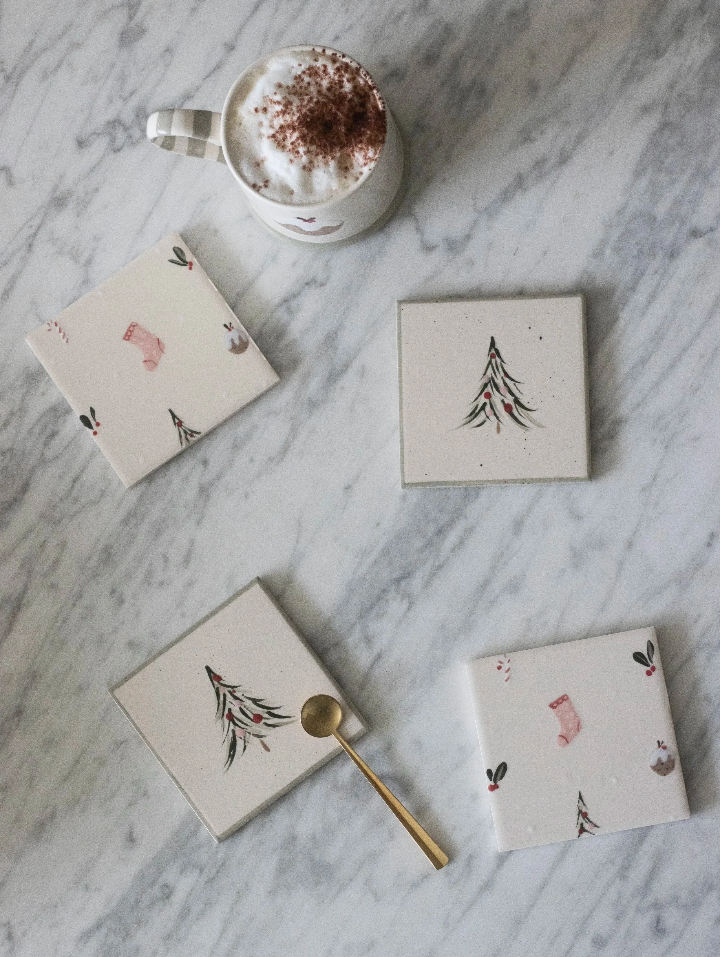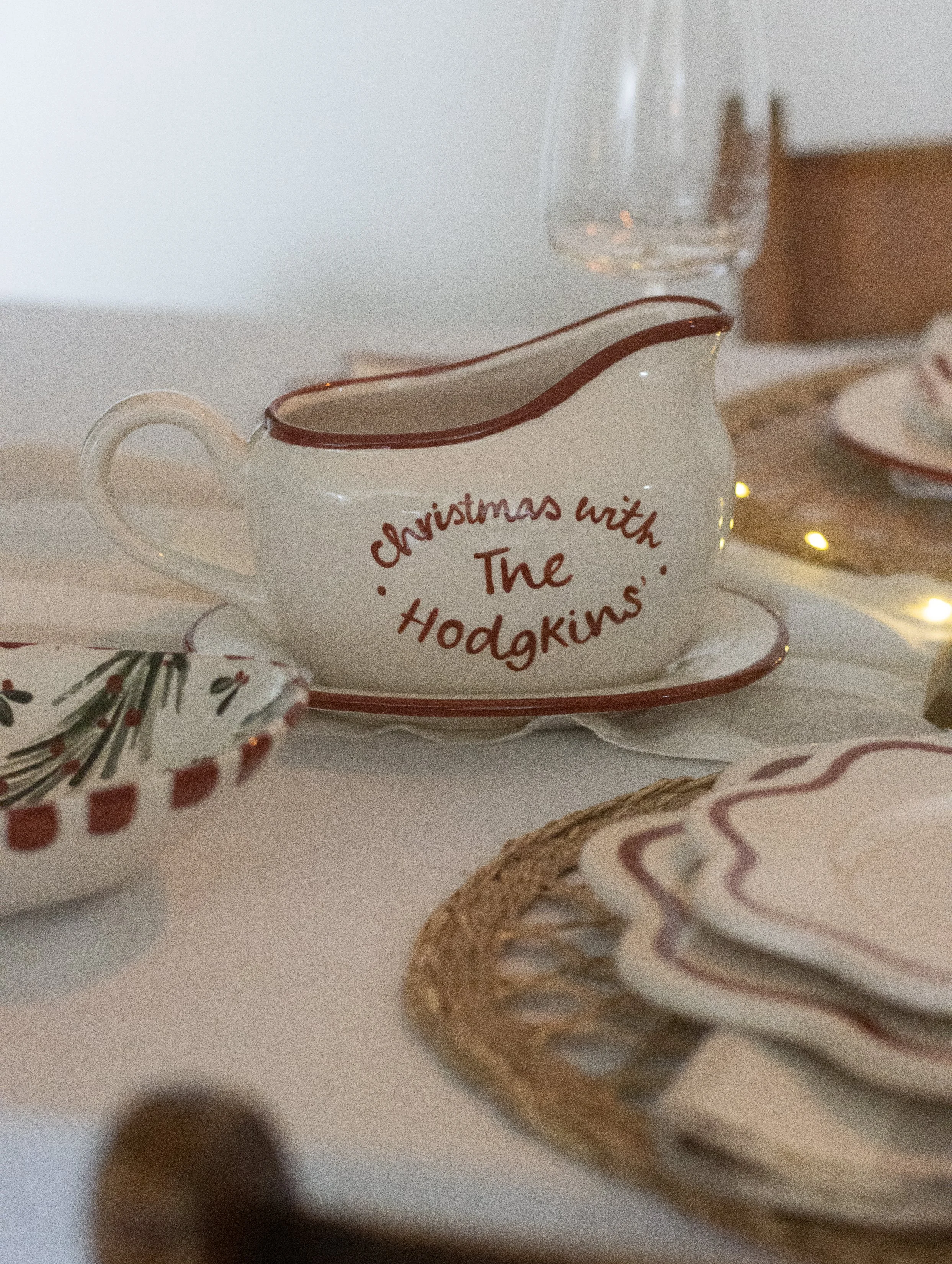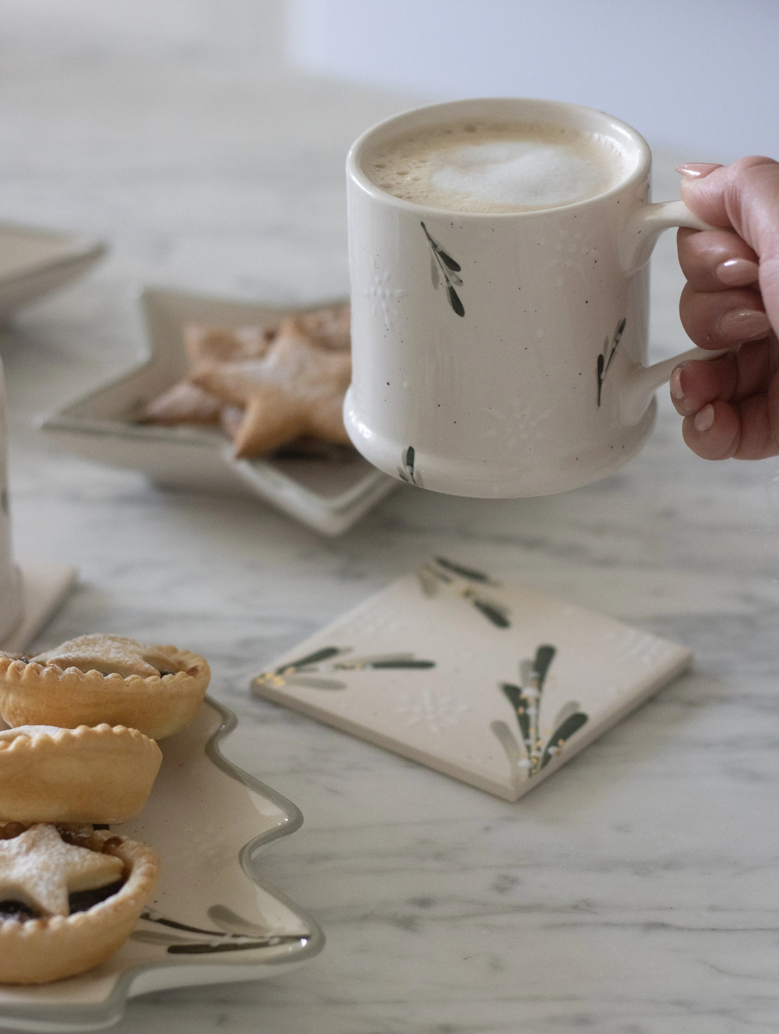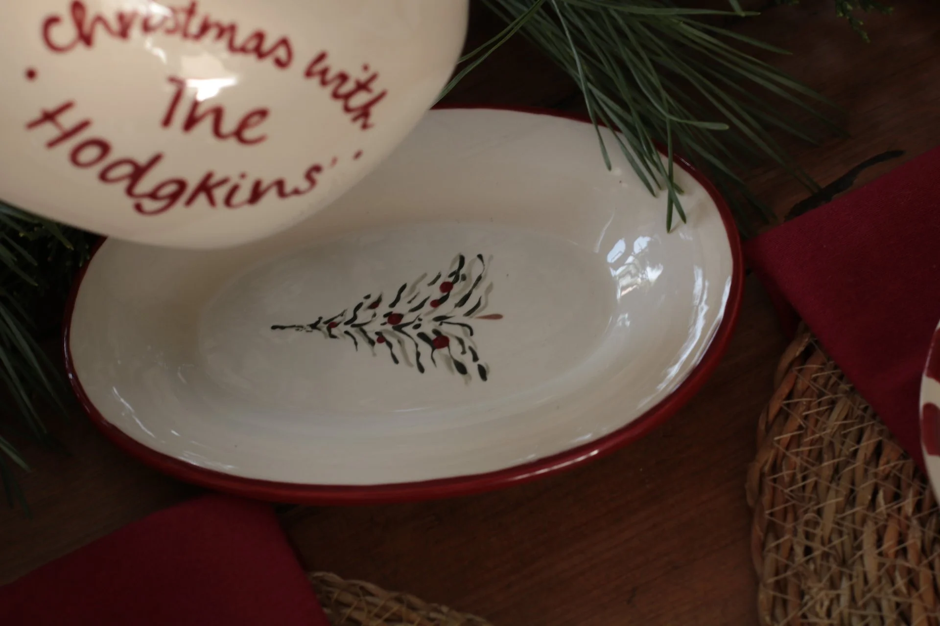 Ceramic country mug featuring a hand-painted Christmas design. Traditional Christmas tree with pink and burgundy accents making this our cosiest collection yet!